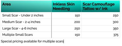 This chart reflects pricing estimates per area / per session, for both inkless and scar camouflage tattoo (with ink).
