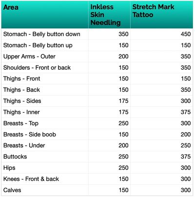 This chart reflects pricing estimates per area / per session, for both inkless and camouflage tattoo (with ink). For many stretch marks, inkless skin needling is sufficient. These prices are only estimates. The actual cost will depend on the size and severity of the area, and its treatment requirements.